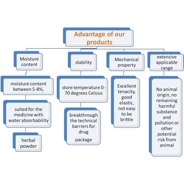 It is suited for the standard of Pharmacopoeia of the people’s republic of China (2010 Edition, Volume II). The moisture content is between 5-8%, so, very suited for the materials with water absorbability, such as herbal powder. The store temperature is 0-70℃. No need for sterilize with ethylene oxide. Empty vegetable capsule fill up the blank of our country and achieve the advanced level in our country. It breakthrough of the technical barriers for drug package and improve the marketing competitiveness of our country’s drug package.